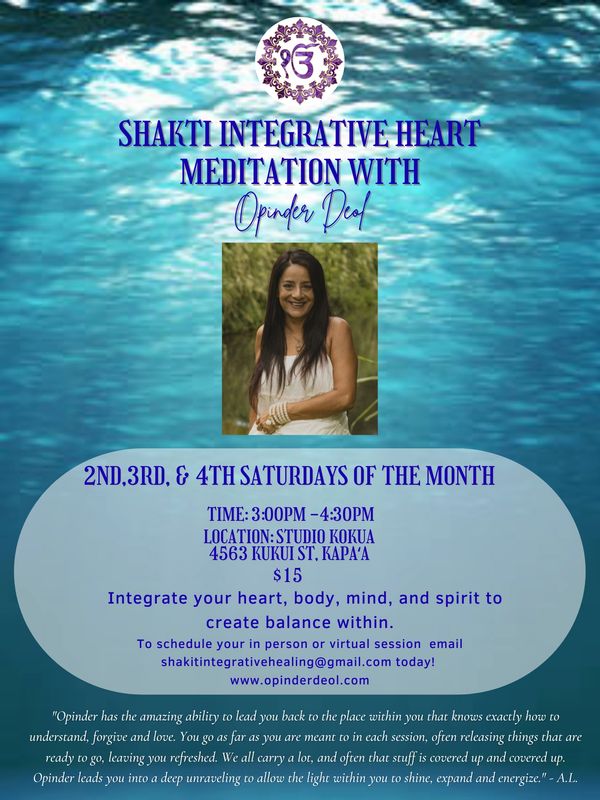 Join Opinder on the 2nd, 3rd, and 4th Saturdays of each month from 3:00–4:30 PM at Studio Kokua, Kapa’a. Reconnect your heart, body, and spirit. Whether you’re a seasoned meditator, have tried but haven’t found the right fit, or are brand new to meditation—this dynamic class is for everyone.